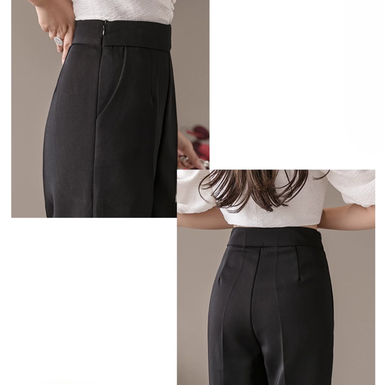 ハイウエストデザインとメタルバックルが洗練された印象を与えるクロップド丈パンツ。