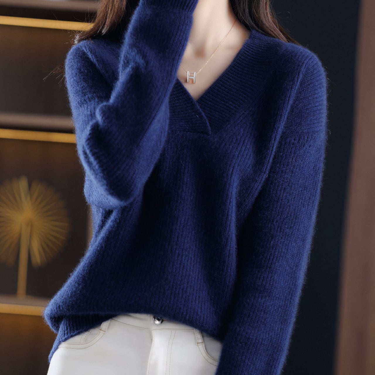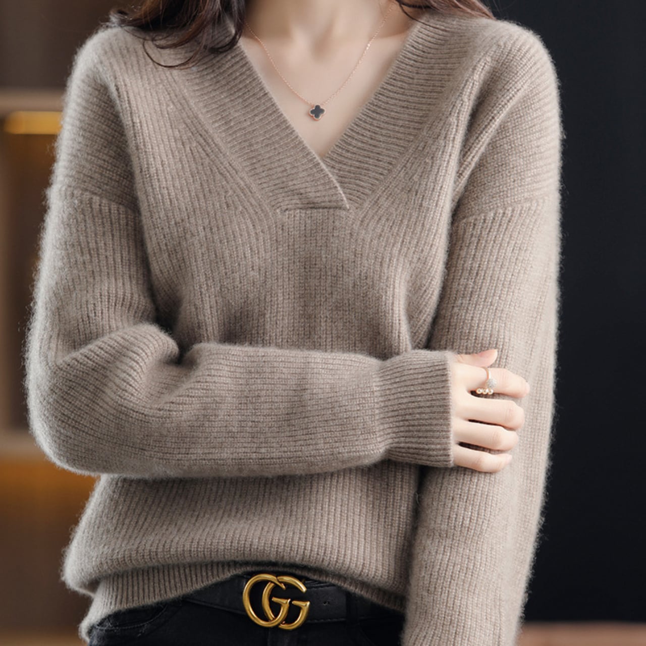 Vネックの洗練されたデザインと、リブ編みの上品なシルエットが魅力のプルオーバー。