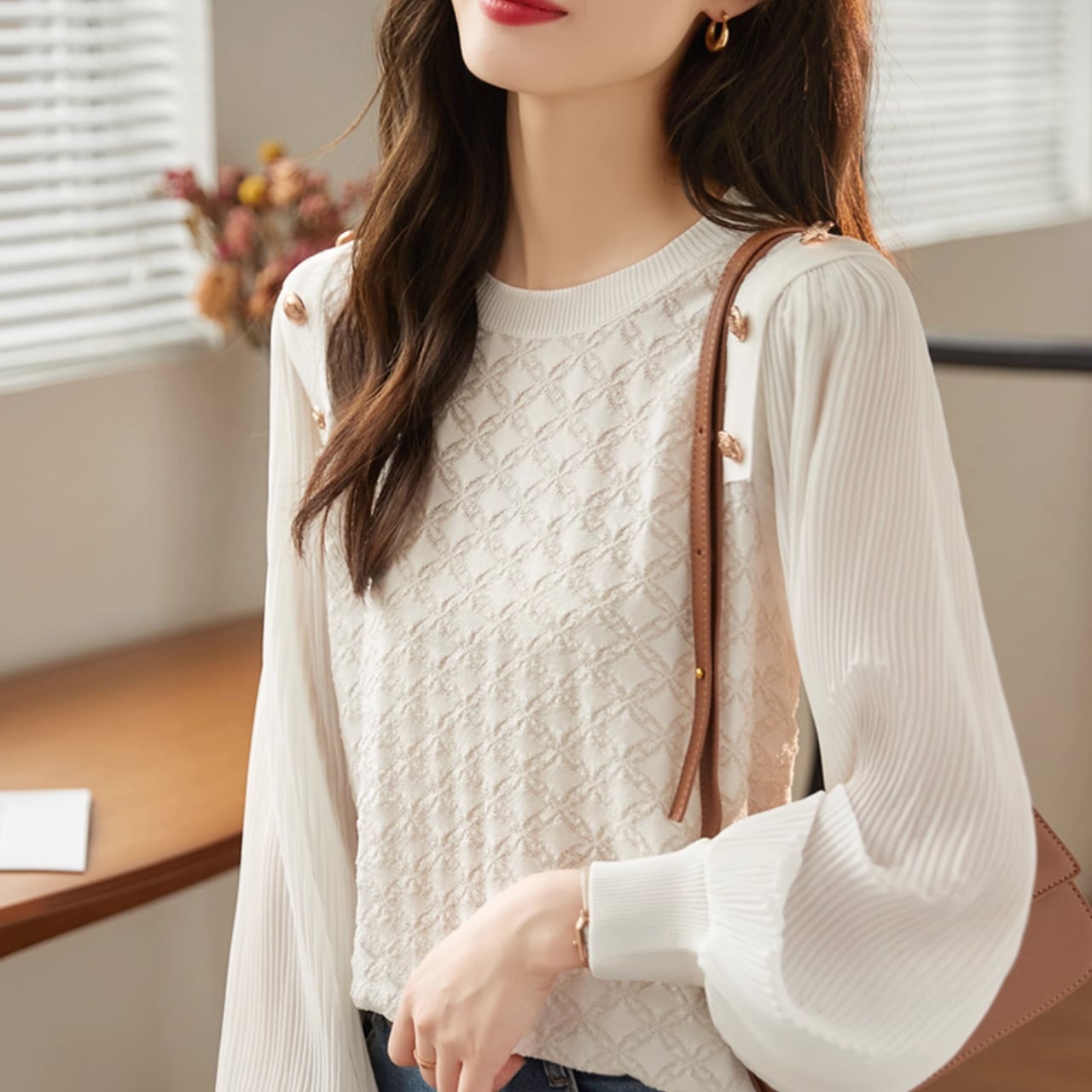 バルーンスリーブが女性らしいシルエットを演出するニットトップス。