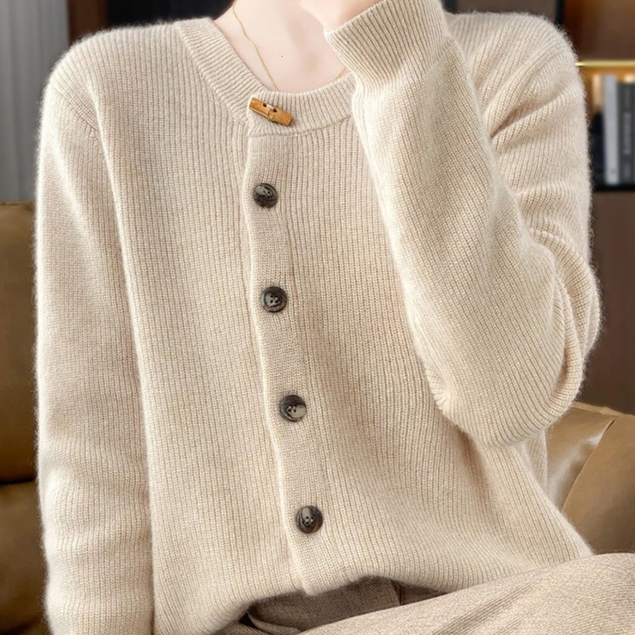 アシンメトリーなボタンデザインが目を惹くニットカーディガン。