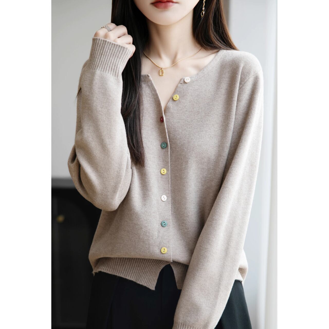 ボタンフロントがアクセントになった、腰丈の長袖ニットカーディガン。