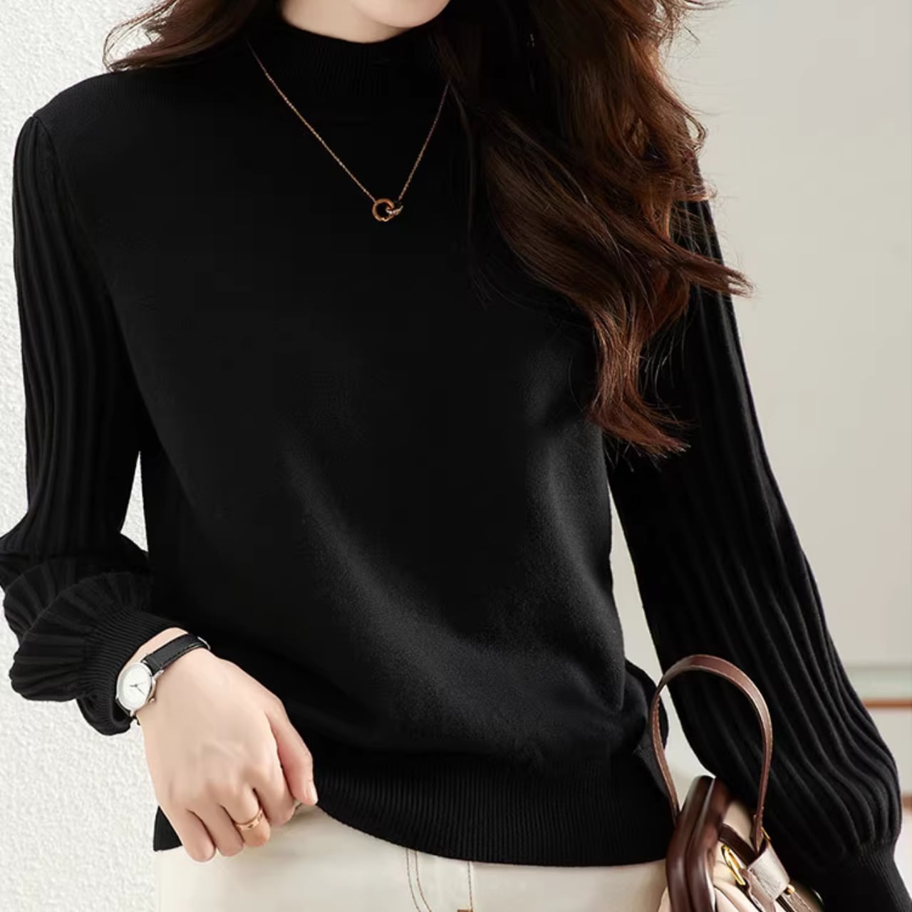 首元を優しく包み込むモックネックが、上品な雰囲気をプラスします。