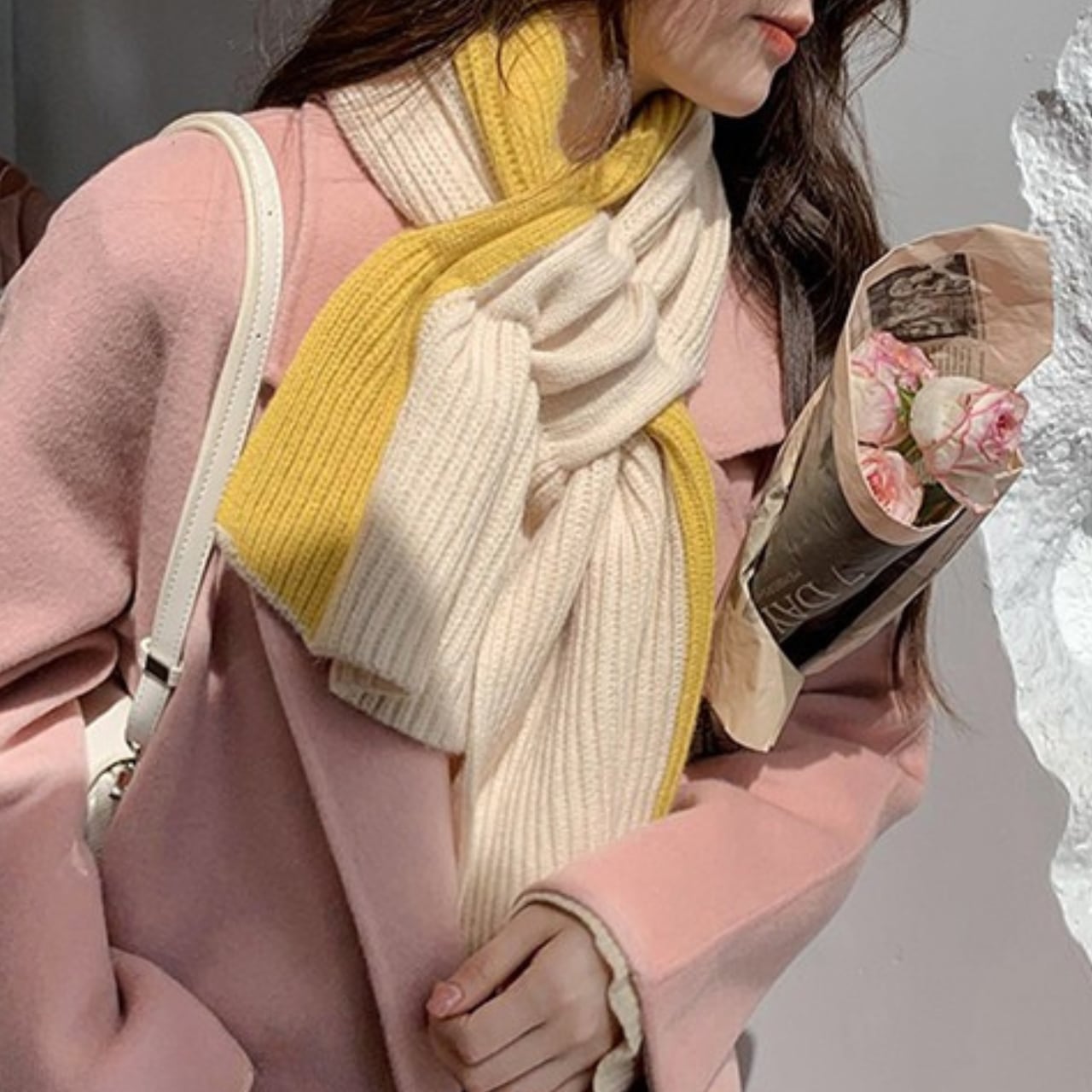 通し穴があるので、マフラーを巻くのが苦手な方でも穴に通すだけで簡単にリボンスタイルが作れます。