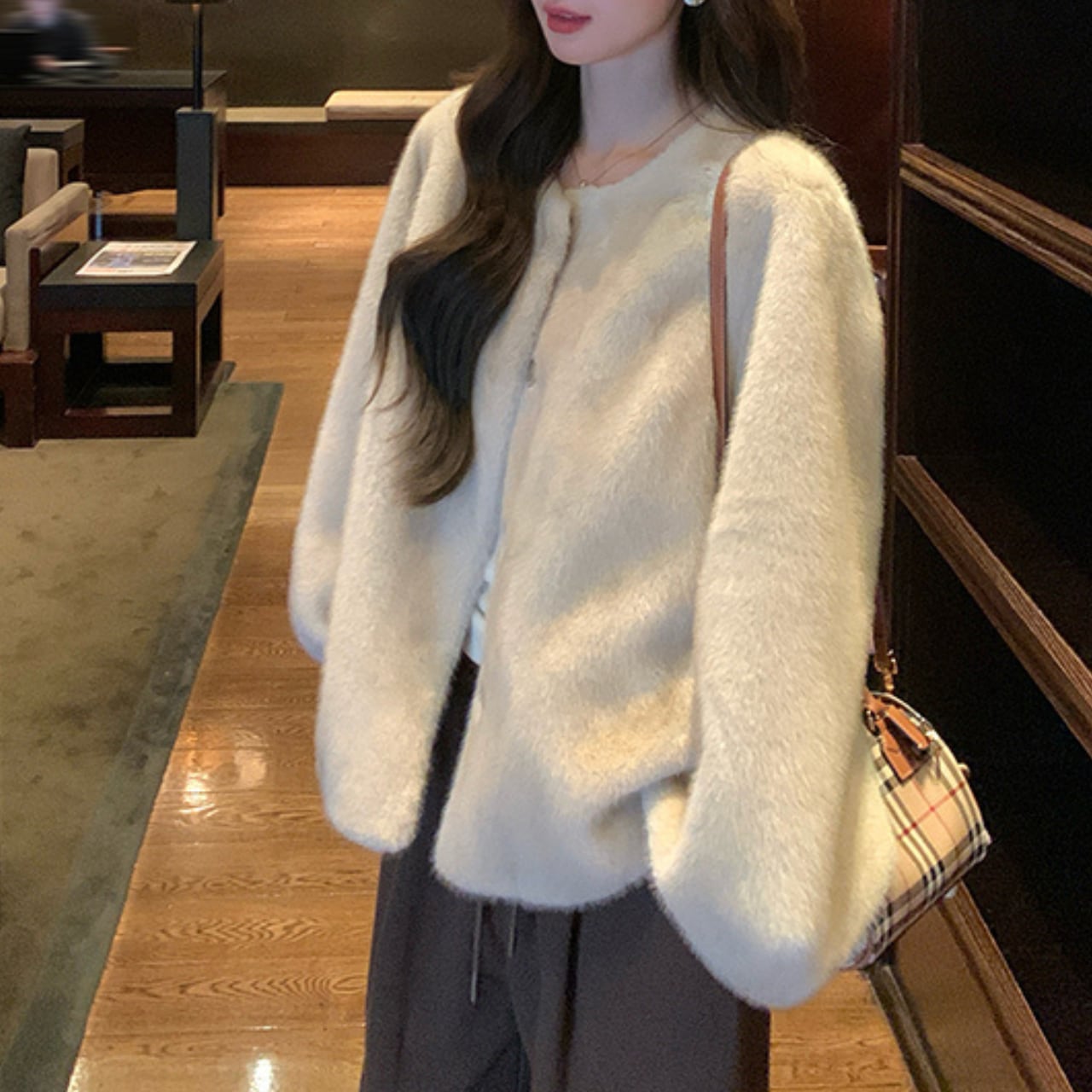 ノーカラーなので、タートルネックやマフラーとの組み合わせも楽しめます。