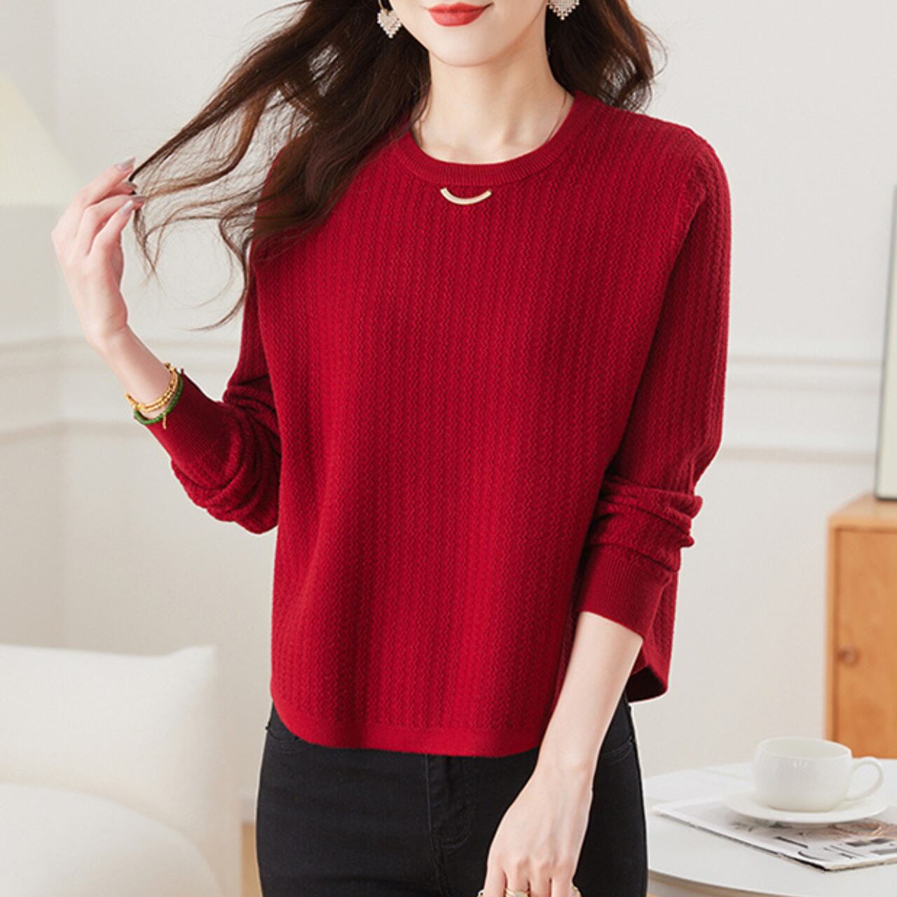 シンプルなクルーネックの長袖ニットトップス。