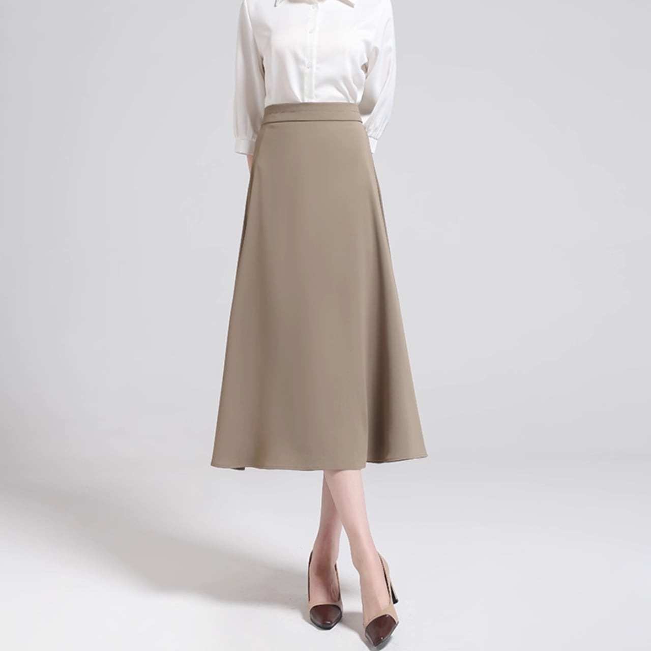 上品なシルエットが魅力のミモレ丈Aラインスカート。