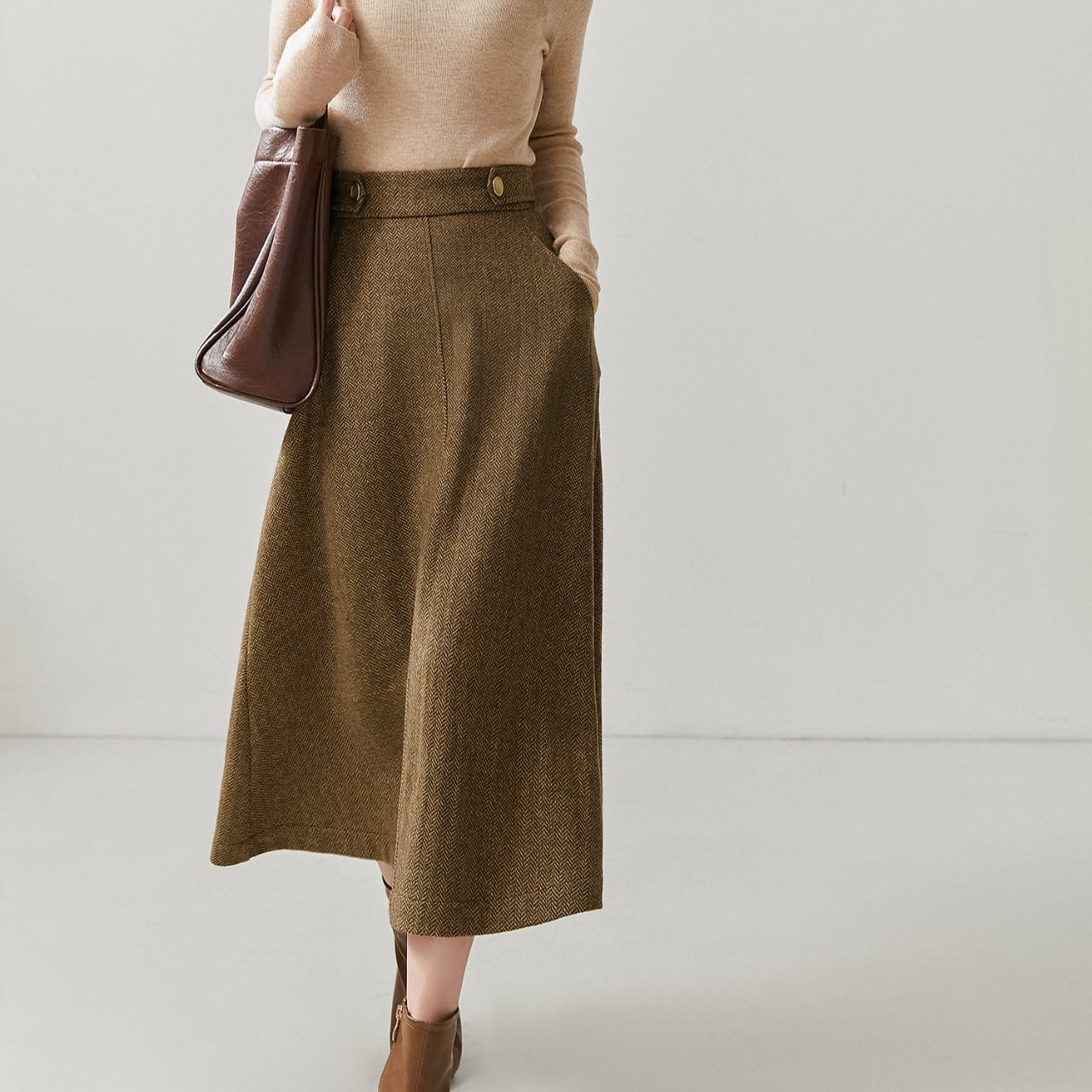 ボタン ヘリンボーン ミモレ丈 Aラインスカート K1170
